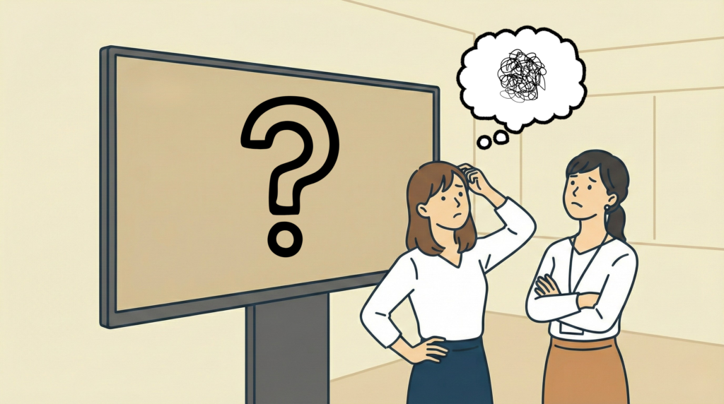 その一環として取り組んでいるのが、社内7箇所に設置された大型デジタルサイネージによる情報発信です。世界情勢のニュースや社内研修の周知など、重要な情報を社員の目に留まる形で届けるため、デザイン未経験の担当者が試行錯誤を続けていました。